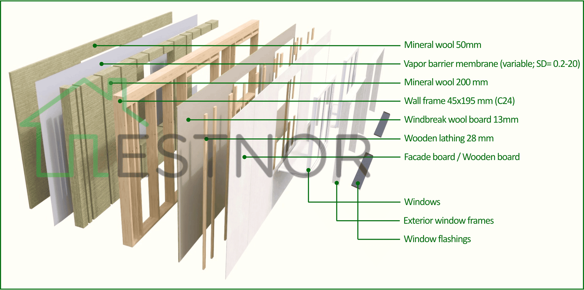 EstNor participated very successfully in the pilot project of the first Kredex reconstruction support measure in 2022, securing the production of facade elements for 12 apartment buildings. Facade elements for all 12 buildings are produced at the EstNor factory on a wooden structure. Insulation wool is installed in the elements, new energy-efficient PVC windows are installed and finished, and the facade finishing board is also pre-installed at the EstNor factory.